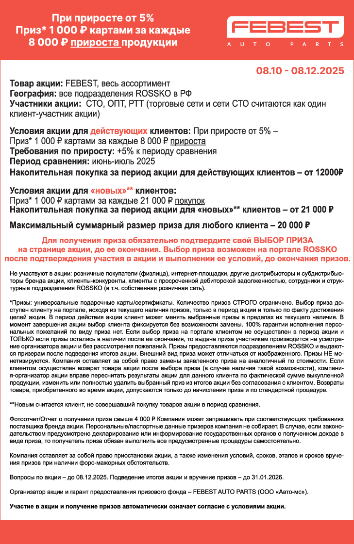 08.10 - 08.12.2025 «При приросте от 5% – приз* 1 000 ₽ картами за каждые 8 000 ₽ прироста продукции FEBEST»